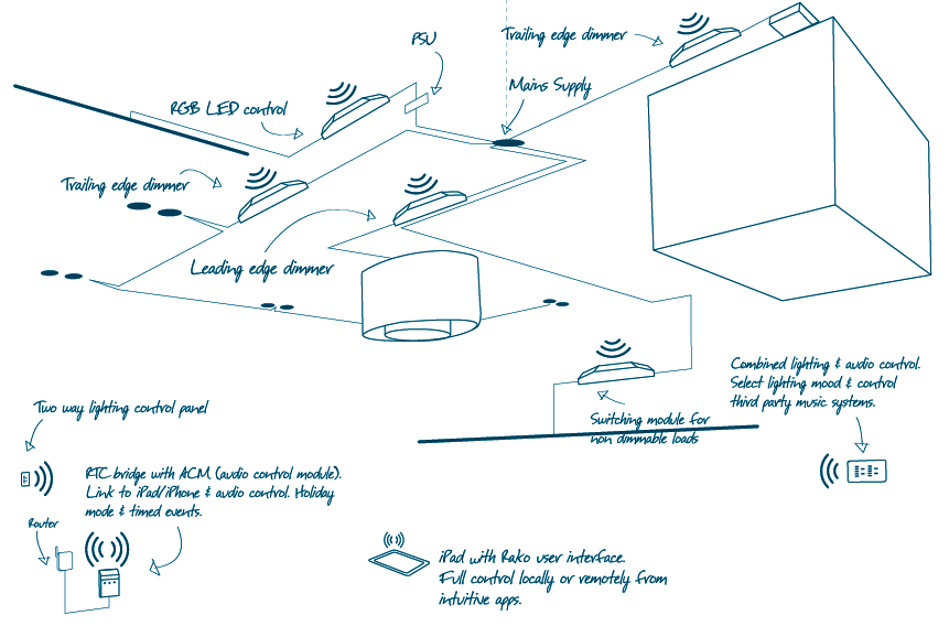 Беспроводные системы могут задействовать как отдельные модули Rako, так и систему RAK с беспроводным интерфейсом RxLink.